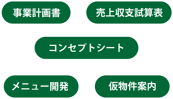 計画書、売上収支試算表、コンセプトシート等が含まれます。
